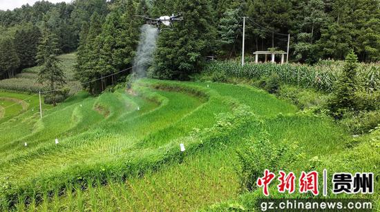 中新网贵州新闻8月11日电(邓维宣 谢永奇)“嗡嗡嗡——”贵州省毕节市赫章县平山镇双塘村的水稻田里,一架无人机正贴着稻穗低空掠过,细密的雾滴如春雨般洒落。