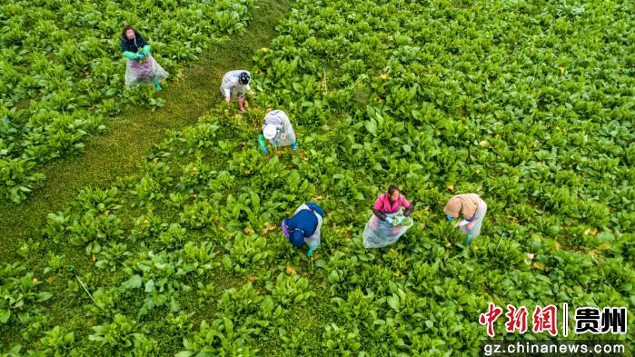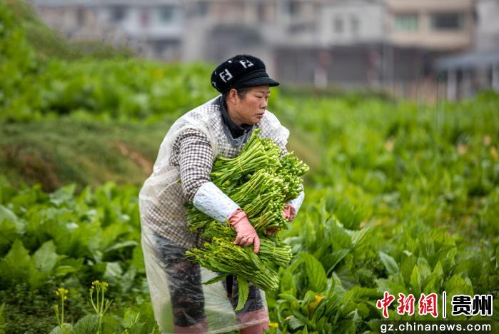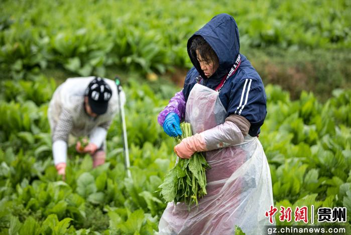 2026年1月20日,村民在贵州省黔西市水西街道新潭社区蔬菜基地采收青菜苔。大寒时节,黔西市不少村民积极开展农作物冬收冬种冬管等工作,田间地头一派忙碌景象。(史开心 摄)