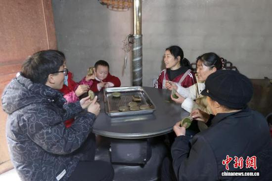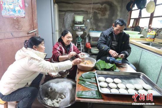吴冬莲(中)与家人在赶制棉菜粑,供应节前市场。唐鹏 摄