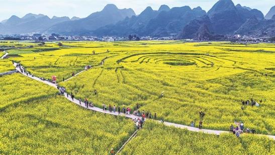 2月20日,黔西南州的万峰林景区,连绵起伏的喀斯特峰林间,油菜花竞相绽放,层层叠叠的金黄顺着田埂起伏,从山脚一直铺展到白墙灰瓦的布依族村寨旁,与蜿蜒的纳灰河共同勾勒出“峰林成屏、花海为画”的独特景致,吸引了众多游客前来踏青赏花。