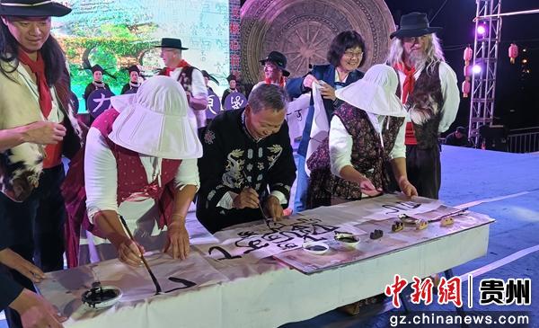 互动环节中,水族古老文字“水书”成为焦点。法国友人现场学习书写水书,并获赠水书书法。