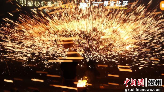 作为流传千年的非遗技艺,打铁花表演一亮相便惊艳全场。非遗传承人将滚烫的铁水奋力挥洒,铁水腾空瞬间化作漫天银花,如万点星辰闪耀在习水的夜空,璀璨夺目、震撼人心。