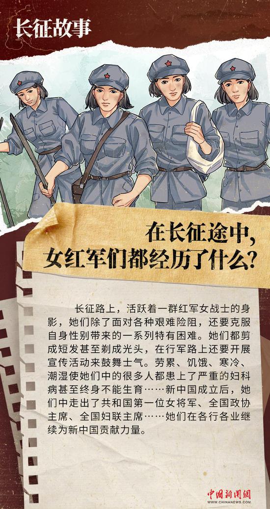 长征路上,活跃着一群红军女战士的身影,她们除了面对各种艰难险阻,还要克服自身性别带来的一系列特有困难。她们都剪成短发甚至剃成光头,在行军路上还要开展宣传活动来鼓舞士气。劳累、饥饿、寒冷、潮湿使她们中的很多人都患上了严重的妇科病甚至终身不能生育……新中国成立后,她们中走出了共和国第一位女将军、全国政协主席、全国妇联主席……她们在各行各业继续为新中国贡献力量。(制图:赵芯)