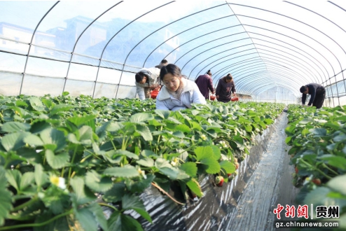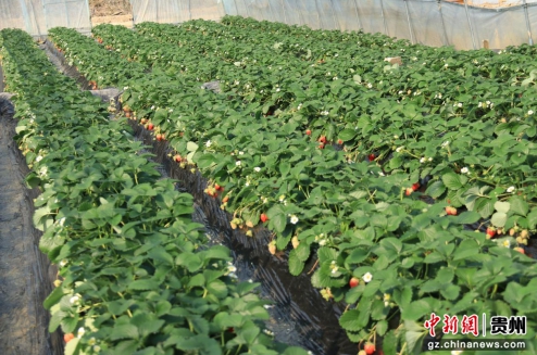 中新网贵州新闻1月13日电(胡伟 罗补发 田家欣)连日来,贵州省松桃苗族自治县甘龙镇白泥村草莓园里,一垄垄草莓长势喜人,红果点缀其间。周边群众和游客纷至沓来,采摘、拍照,田间地头一派热闹景象。
