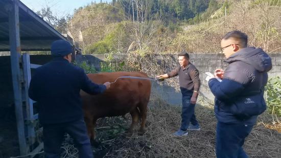 “大伯,我们测量,拿体尺估算公式来测算,这头牛将近有800斤,该出栏了嘞。”一大早,月亮山村的驻村干部、村干和养殖户们将散养在大山上的高原黄牛赶回山下,进行测量筛选,准备出栏。这些黄牛身形健壮,毛色光亮,是月亮山村生态养殖的“明星产品”。